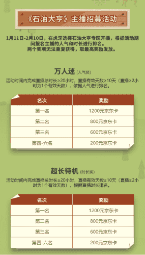 除了“油王”争霸赛,,,精英主播招募活动亦同步开启!!赛事分时长奖和人气奖,,,奖励同样丰厚!!!!