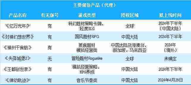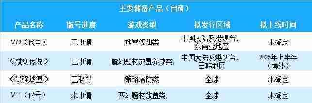 公司有多款储备产品,,,,涵盖放置类、、、、策略类、、、RPG、、Roguelike等多元化游戏品类,,储备的主要自研和代理产品如下::