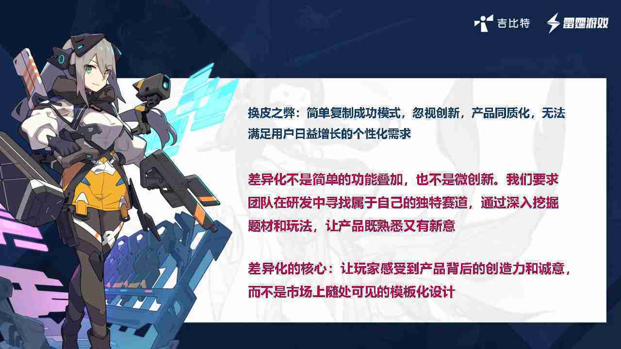 在我们内部是这么定义差异化的。。。首先,,,差异化不是简单的功能叠加,,,更不是换皮。。。只是换皮,,,产品无法提供有效的市场价值。。。。内部经常说差异化的产品不是为了迎合市场,,而是找到一个自己独特的表达方式,,,在研发中找到属于自己的细分赛道和独特赛道,,,前提是需要对这个题材有足够的深入、、、挖掘,,,对玩法有足够深入的理解,,,,让产品看起来既熟悉又有新意。。。